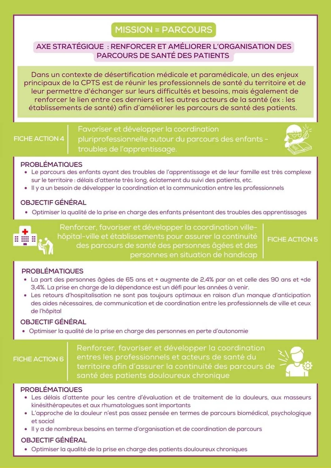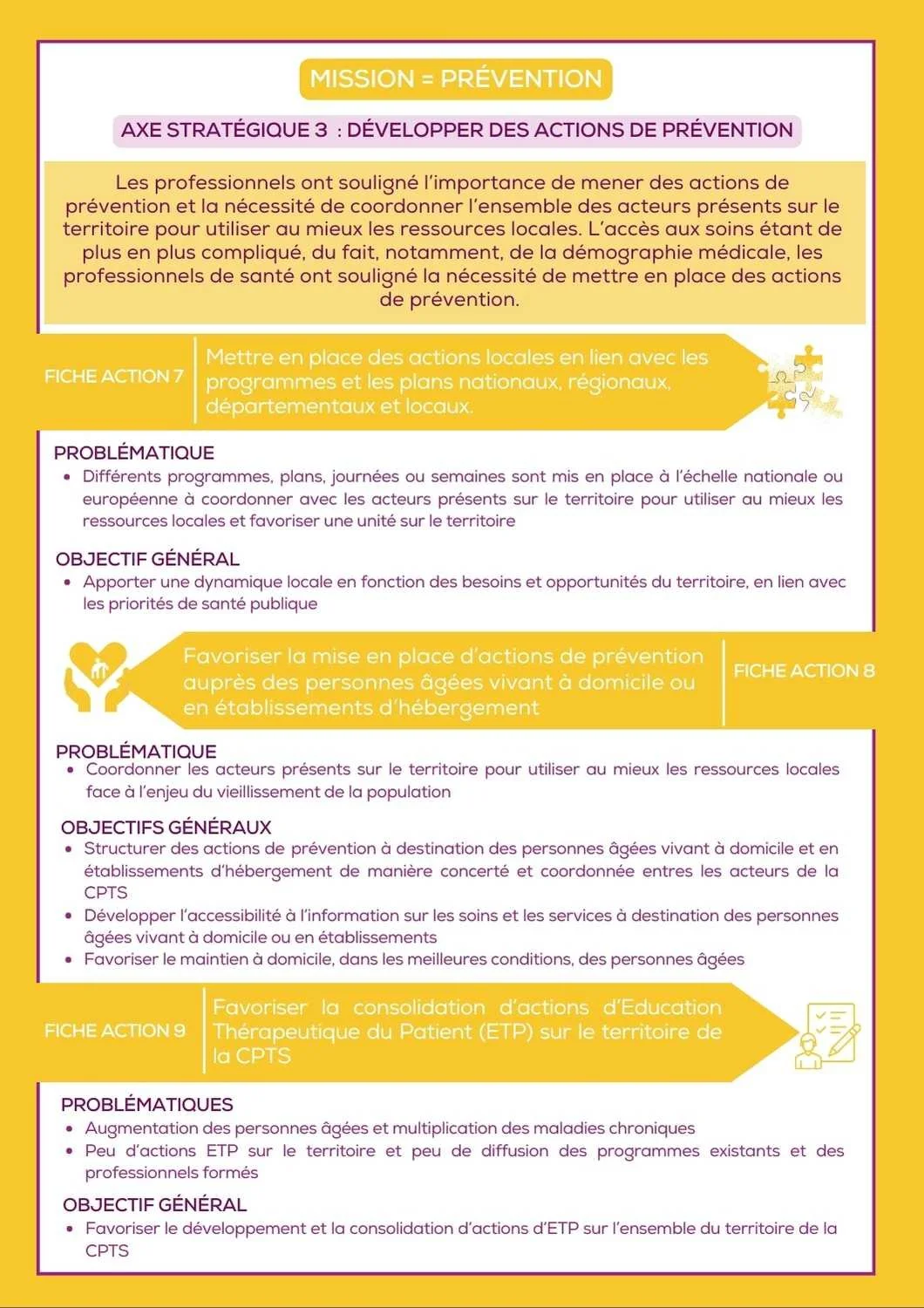 Vous y retrouverez les résultats ainsi que les perspectives pour chacune d’entre elles. Ce document sert de base pour les réflexions menées pour le futur projet de santé afin de veiller à prolonger les actions ayant fait leurs preuves et à en initier des nouvelles pour répondre à des enjeux émergents.